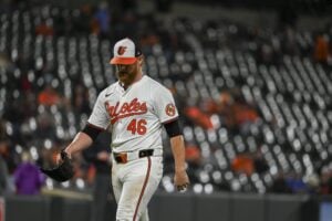 Sep 17, 2024; Baltimore, Maryland, USA; Baltimore Orioles pitcher Craig Kimbrel (46) walks off the field after being removed during the ninth inning against the San Francisco Giants at Oriole Park at Camden Yards. Mandatory Credit: Tommy Gilligan-Imagn Images