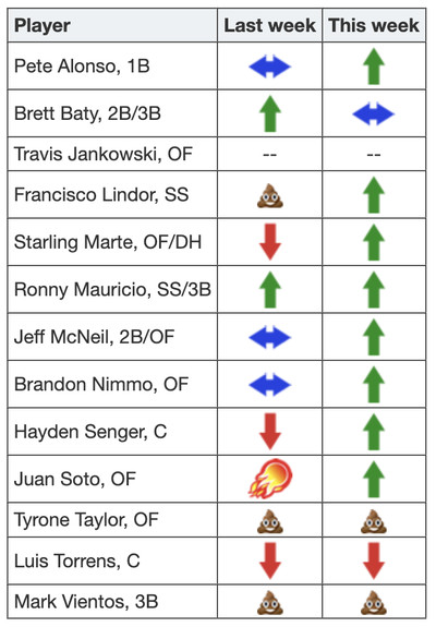 It is tough to say whose roster spot Winker will take when he does return. Travis Jankowski has not really played much, so he feels like an obvious candidate, since he has more or less just been pinch running and not doing anything else. But Winker locking up most of the DH at-bats on the long side of the platoon means it will be hard to find at-bats for both Brett Baty and Ronny Mauricio. Baty had just three hits in 16 plate appearances this week, but one of those hits was a home run. Baty scored two runs, drove in two runs, and walked once this week. Mauricio had a productive week with four hits—three singles and a double—in 12 plate appearances with four runs scored. He also walked twice, which is encouraging.