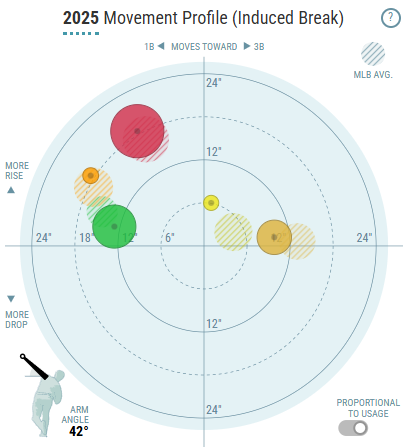 Being able to dial it down a bit to ~95 MPH instead of ~97 MPH would be a great help for his ability to pitch over 100 IP, which he did fairly regularly before the 2025 season.