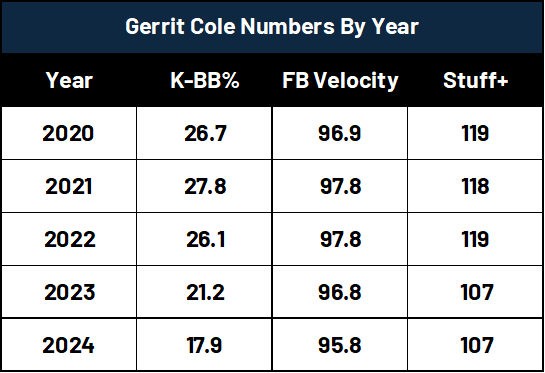 As for Gerrit Cole, while he was a recent Cy Young Winner, the pitcher who took home that award is not the one he is as things stand right now.