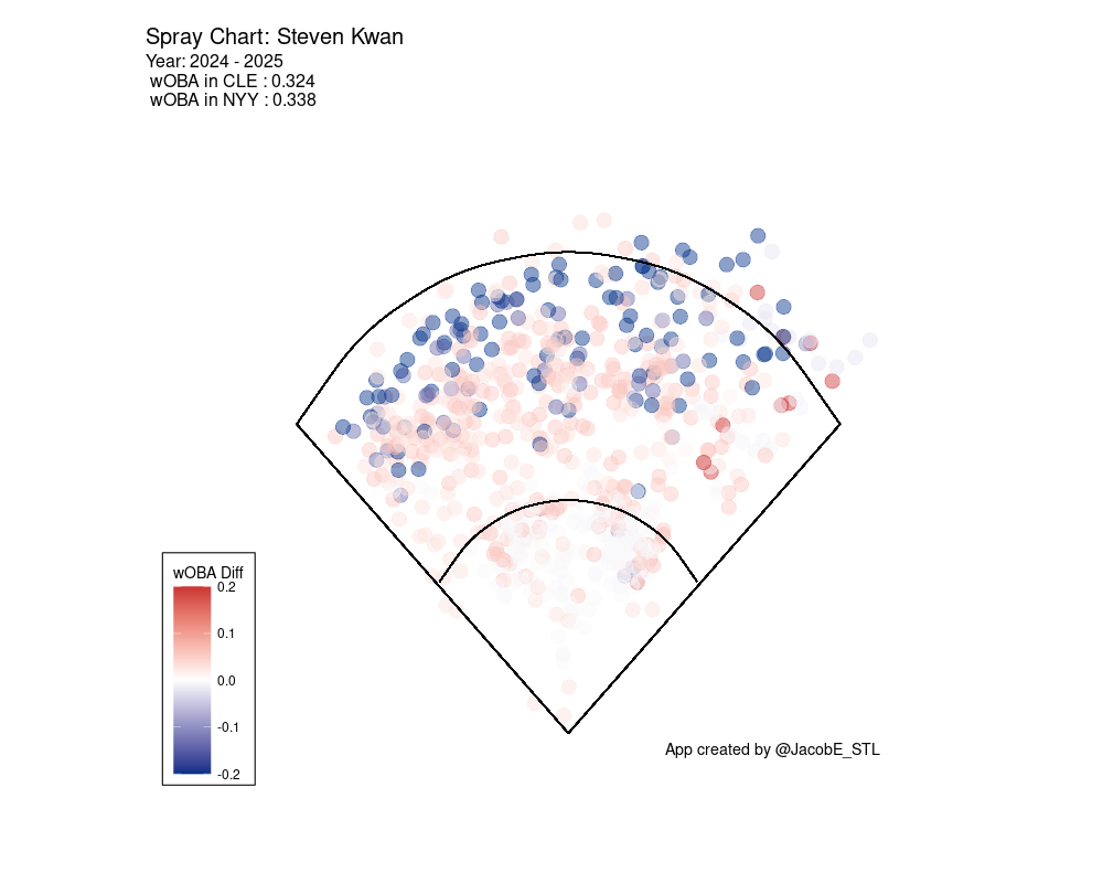 According to this wOBACON estimator by Jacob Edelman, a writer at Baseball Prospectus and Baseball Analyst at Wake Forest (@jacobledelman), Kwan would have been a better hitter at Yankee Stadium than Progressive Field (since 2024).