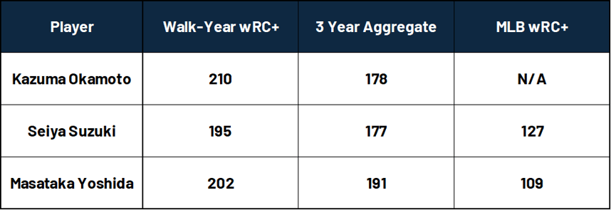 In terms of production, Okamoto compares to both Yoshida and Suzuki, who have been good hitters at the Major League level so far.
