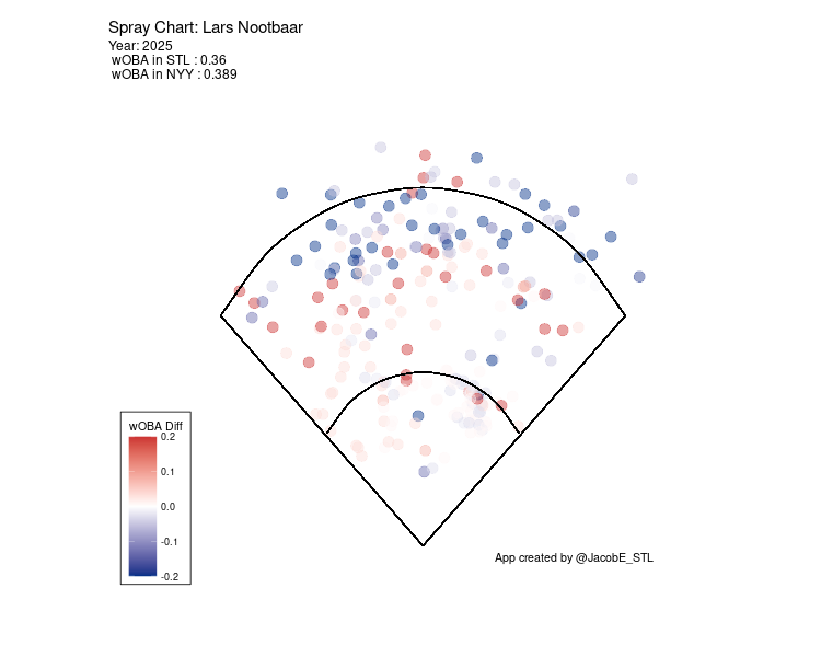 For similar reasons as to Brendan Donovan, Lars Nootbaar would perform well at Yankee Stadium relative to Busch Stadium, and he doesn’t even pull a lot of his flyballs.