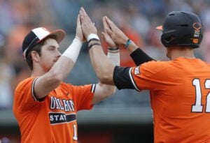 May 28, 2021; Oklahoma City, Oklahoma, USA; Oklahoma State infielder Hueston Morrill (1) high fives Carson McCusker (12) after he hits a home run against West Virginia during the Big 12 Conference Baseball Tournament at Chickasaw Bricktown Ballpark. Mandatory Credit: Alonzo Adams-USA TODAY Sports