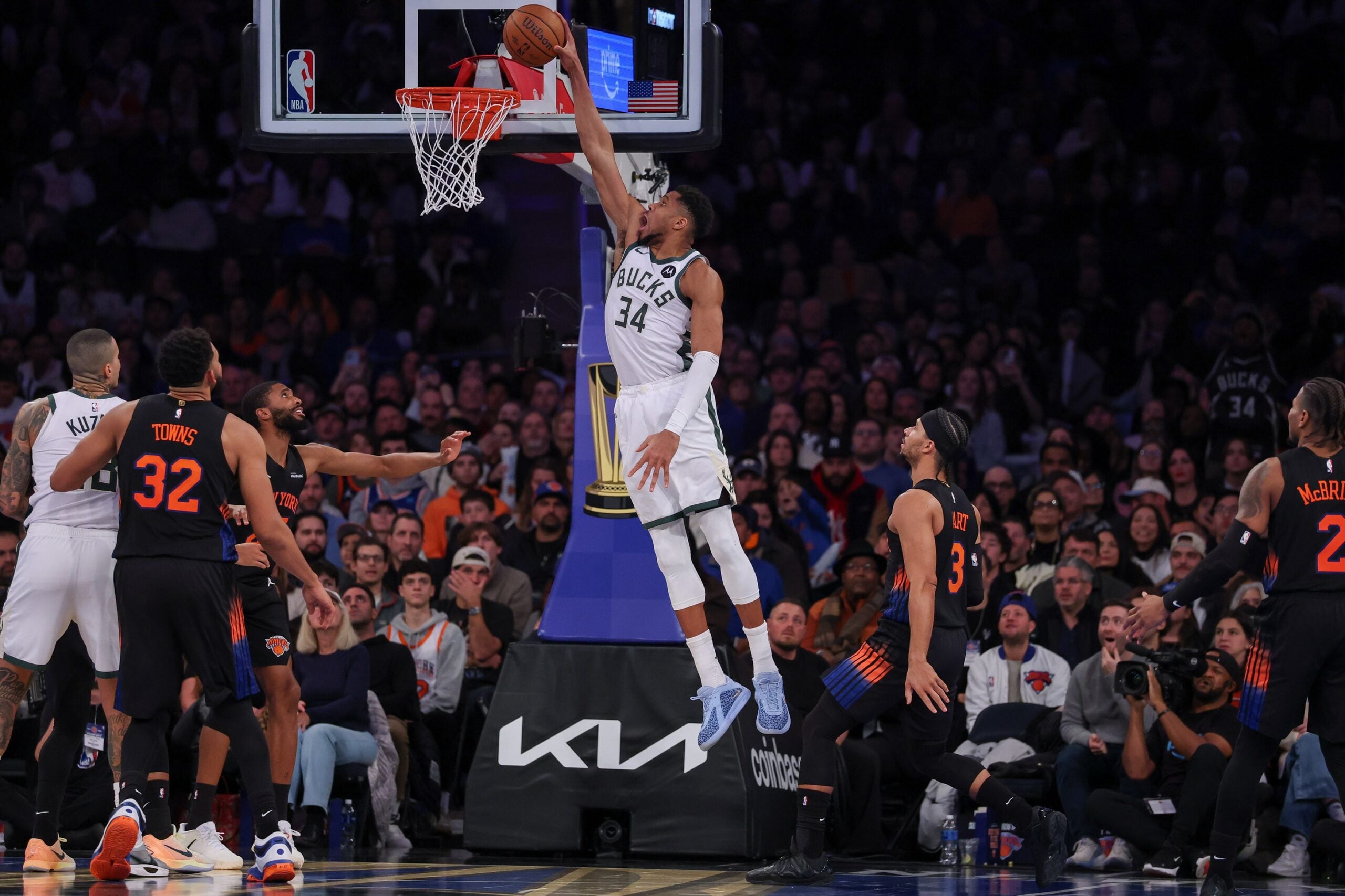 Nov 28, 2025; New York, New York, USA; Milwaukee Bucks forward Giannis Antetokounmpo (34) dunks the ball in front of New York Knicks guard Josh Hart (3) during the second half at Madison Square Garden. Mandatory Credit: Vincent Carchietta-Imagn Images
