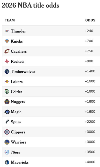 The Oklahoma City Thunder are the early favorites to repeat and win the 2026 NBA title, but the New York Knicks are not far behind in the opening title odds across multiple sportsbooks.