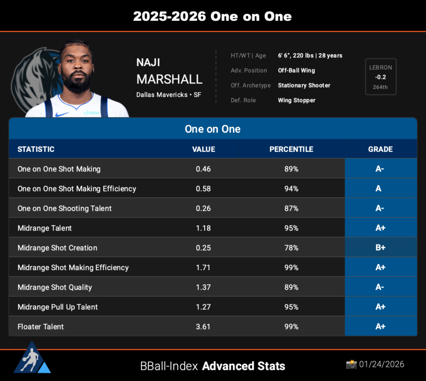 The underlying metrics show he thrives in these difficult matchups. With an A grade in perimeter defense isolation, Marshall does a fantastic job of limiting shot quality and attempts.