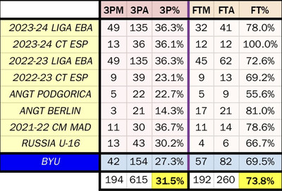 Though Egor Dëmin made just 27.3% of attempts at BYU, though his historical data suggests that may have been somewhere between an outlier and a result of taking so many difficult, off-the-dribble attempts…