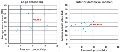 A similar story can be told for IDLs in the figure on the right. You can say from the figure that there are two tiers of IDLs: Those making in tens of $M and those making in the 20s of $M. Lawrence is in the upper tier of salaries but is not the highest, and last year (when he was injured part of the season), he was among the highest in PRP but not THE highest. Again, there is little correlation between how much a good IDL makes and how well he performs. Instead, at any high-value position, in general, you get paid more the more recently you signed. As Ed pointed out, the Giants added just $3M in incentives to Lawrence’s contract, most likely a recognition that in today’s IDL contract environment, his contract has fallen behind his production.