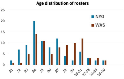 The Giants have many more players age 27 and younger, and especially 24 and younger, than the Commanders do, while the Commanders have many more players age 28-31 than the Giants do. Those two 21-year-olds on the Giants’ roster? Malik Nabers (38 college games) and Abdul Carter (42 college games). Jaxson Dart is 22 (45 college games). Jayden Daniels (55 college games) is 24; that may be one facet of why he excelled so soon as a pro.