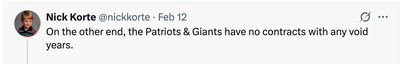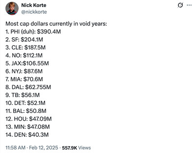 Washington has a relatively modest $29.6M in void year costs on the books so far. That’s a lot more than the nada the Giants have, but it’s not an unworkable amount. The way they have been able to construct a Super Bowl-contending roster, beyond picking the right quarterback at No. 2, is by getting a lot of older players to sign modest contracts, most of them one year at a time, presumably in the players’ eyes for a shot at a ring and/or possibly a shot at one more big contract if they do get a ring. That’s worth having some void money on the books.