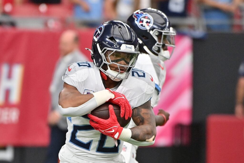 Oct 5, 2025; Glendale, Arizona, USA; Tennessee Titans running back Tony Pollard (20) warms up before their game against the Arizona Cardinals at State Farm Stadium. Mandatory Credit: Matt Kartozian-Imagn Images