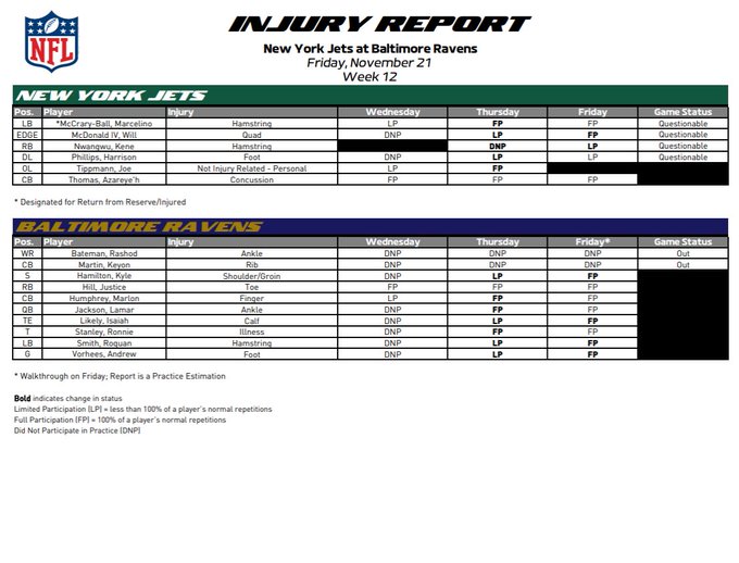 The four players listed as questionable are all expected to play, although the Jets will need to make a roster move if they plan to reactivate McCrary Ball.