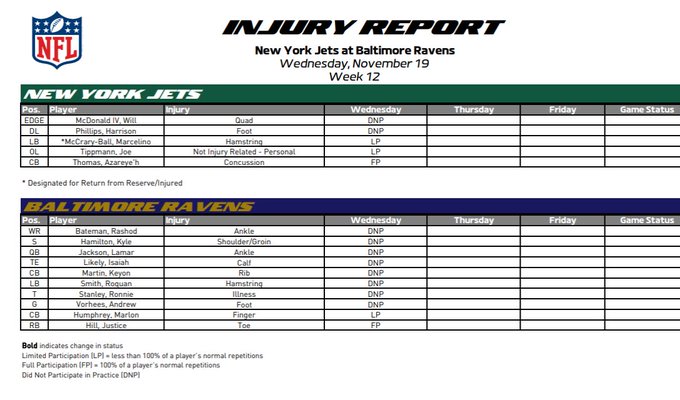 As you can see, the Ravens have several key players who missed practice, although the bigger concern for them – if there is one – is probably taking the Jets too lightly rather than most of these players not being available.