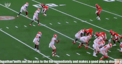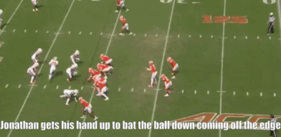 It has been rare for Jonathan to drop into coverage over the course of his career. He does have four passes defensed but these all came on batting or deflecting passes as he rushed the quarterback.