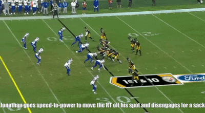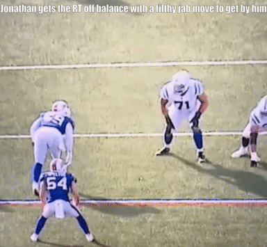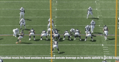 Jonathan wins with a variety of pass rush moves and displayed good technique in terms of his footwork and hand fighting, which he has shown he can operate in sync with each other.