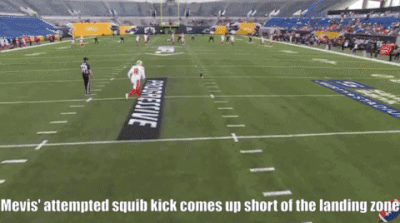 Directional kicking on kickoffs has also been a challenge. On this kickoff in the UFL, he tried to bounce the ball inside the landing zone and failed, leading to a penalty.