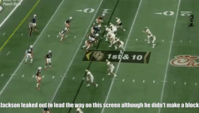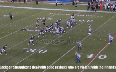 Jackson needs to clean up a few things technique-wise to be able to compete with NFL level talent. He’s pretty good at locking his man down when he gets a grip of him but where pass rushers are able to keep Jackson’s hands off them, this makes it hard for him to stay in front of them.