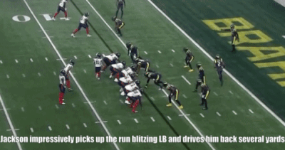 With his size and power, Jackson can be effective on combo blocks and when driving his man back.