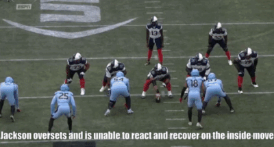 When lined up inside, Jackson shows an ability to re-anchor when moved off his spot and uses his strength to gain leverage and control.